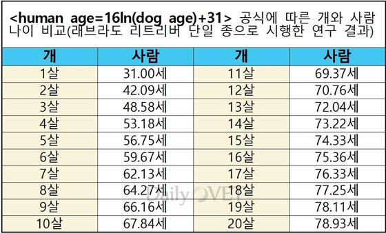 아래 그래프를 보시면 개가 한 살일 때 사람의 나이로는 이미 30~31살에 해당한다는 것을 알 수 있습니다. 개가 네 살이 되면 사람 나이로는 50세가 넘게 되네요. 좀 더 구체적인 수치를 다음 표에서 보시겠습니다.