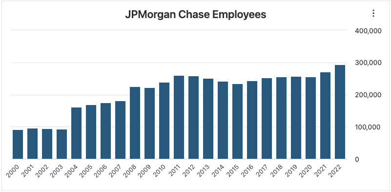 이들 가운데 몇 개 은행의 직원수를 살펴보겠습니다. 먼저 JP모건체이스 은행입니다. 자산 규모가 3조 3천억 달러에 이르는 미국 최대 은행입니다. 그런데 아래 그래프에서 최근 몇 년간 직원수가 빠르게 증가한 것을 볼 수 있습니다. 2020년 25만 5,351명에서 2021년 27만 1,025명, 2022년에는 29만 3,723명으로 크게 늘어난 것입니다.