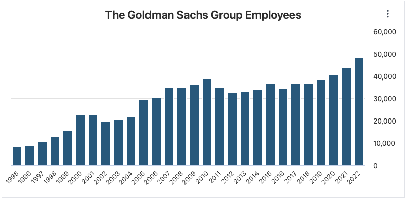 끝으로 골드만삭스를 한번 보겠습니다. 최근 몇 년간 직원수가 빠르게 증가한 것을 볼 수 있습니다. 2018년 3만6,600명에서 2022년 말에는 4만8,500명을 기록했습니다.