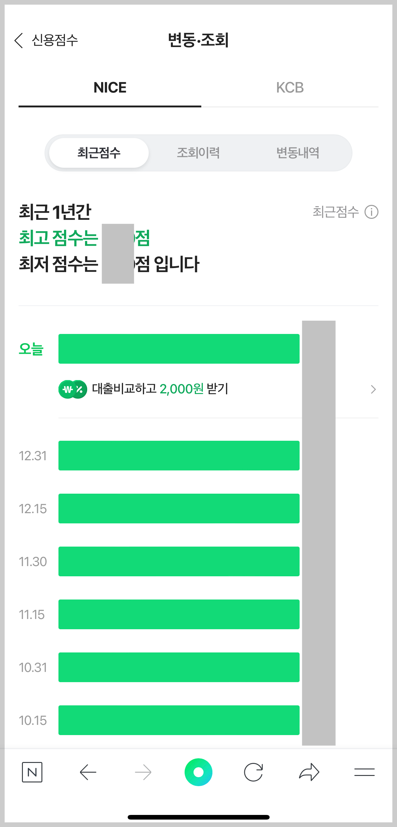 한 가지 더! 위 그림에서 NICE와 KCB의 점수 옆에 '>' 이런 기호가 있는데요. 이 곳을 탭하시면 지금까지 신용점수가 어떻게 변해왔는지에 관한 히스토리와 조회이력, 변동내역 등도 볼 수 있습니다. 아주 쉽죠?^^