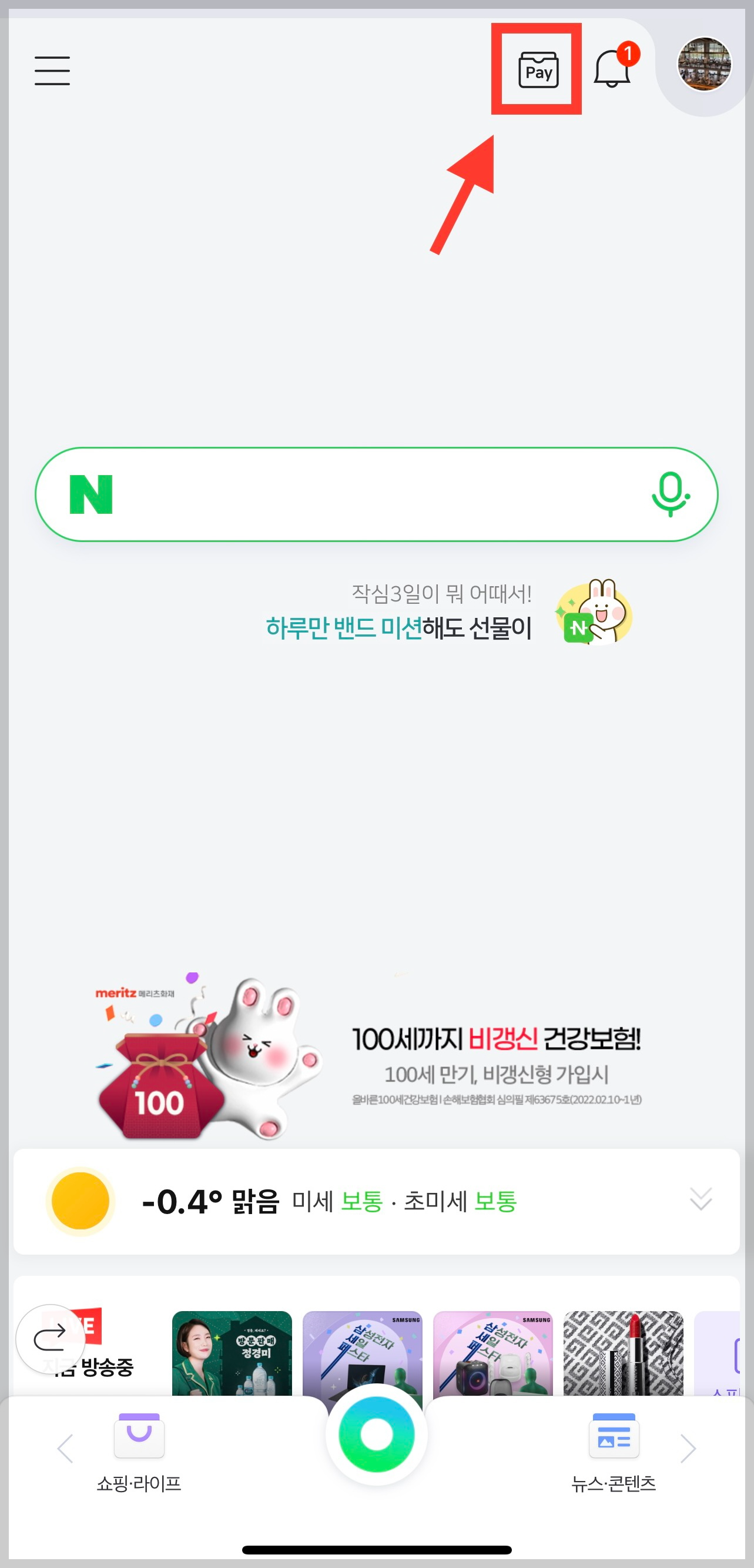 첫 번째는 네이버 앱에서 조회하는 방법입니다. 대부분 휴대폰에 네이버앱을 갖고 계실 것입니다. 네이버앱에서 로그인 하신 다음 기본화면 상단에 네이버페이를 찾으실 수 있을 것입니다. 네이버페이로 들어갑니다.