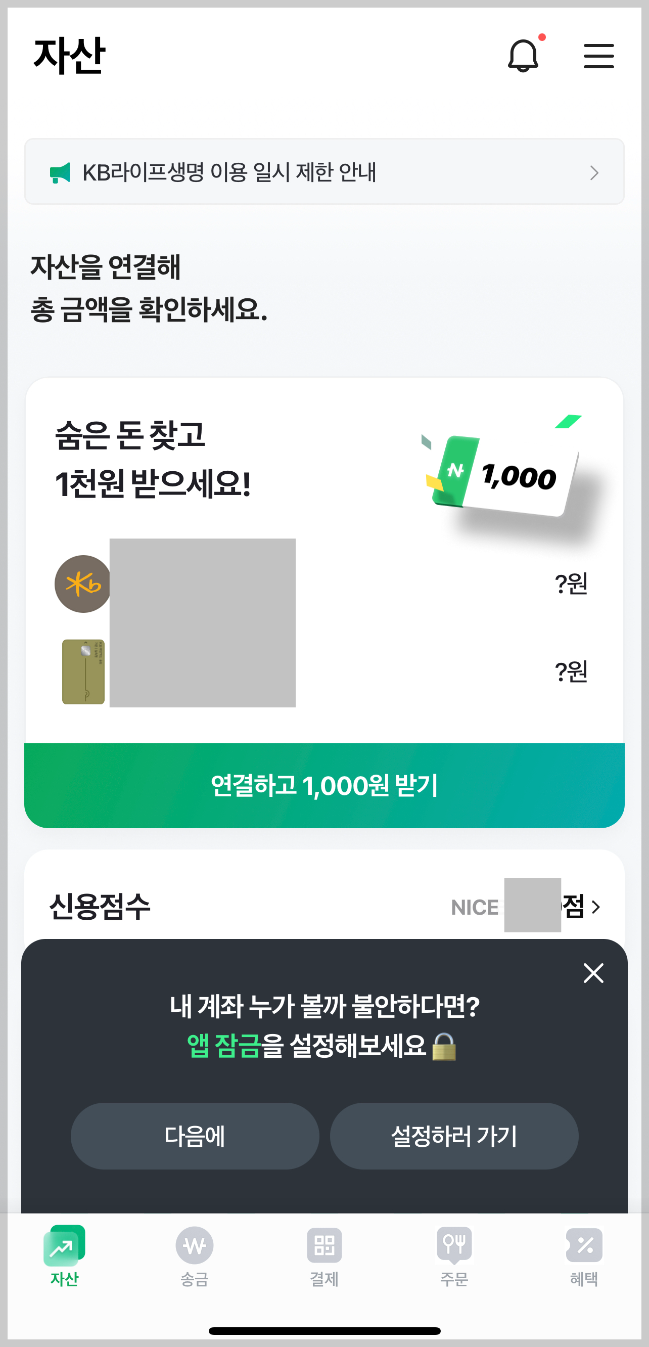 인증을 마치시면 바로 이런 화면이 뜨는데요. 왼쪽 하단에 있는 '자산'을 클릭하시면 바로 신용점수를 확인하실 수 있는 페이지로 이어집니다.