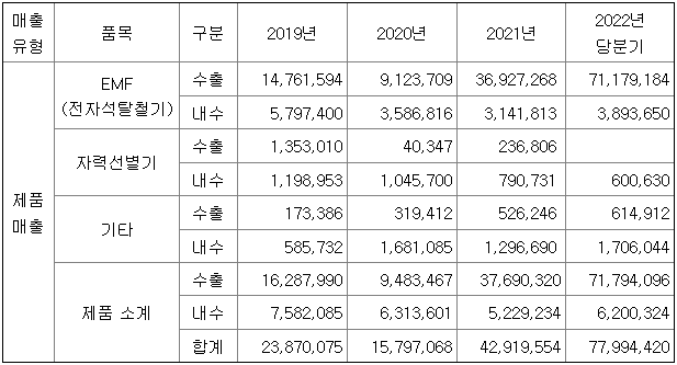 대보마그네틱의 주력 제품은 전자석탈철기(EMF)로 2022년 기준 전체 매출액의 약 6%를 차지하고 있다.