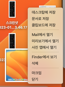 문제는 맥의 경우 윈도우와 달리 자동 복사가 되지 않는다는 점입니다. 그래서 카톡에 붙여넣기를 하기 위해서는 바탕화면으로 나와 방금 캡처한 스크린샷 이미지를 '복사'한 다음 카톡창을 열고 붙여넣기 해야 합니다. 참고로 오른쪽 하단에 이미지가 나타났을 때 마우스를 대고 오른쪽 클릭하면 다음과 같은 창이 뜨는데, 이 때 '클립보드에 저장'을 선택해 주면 캡처한 이미지가 복사됩니다. 하지만 두 가지 방법 모두 윈도우에 비해 복잡한 것이 사실입니다.