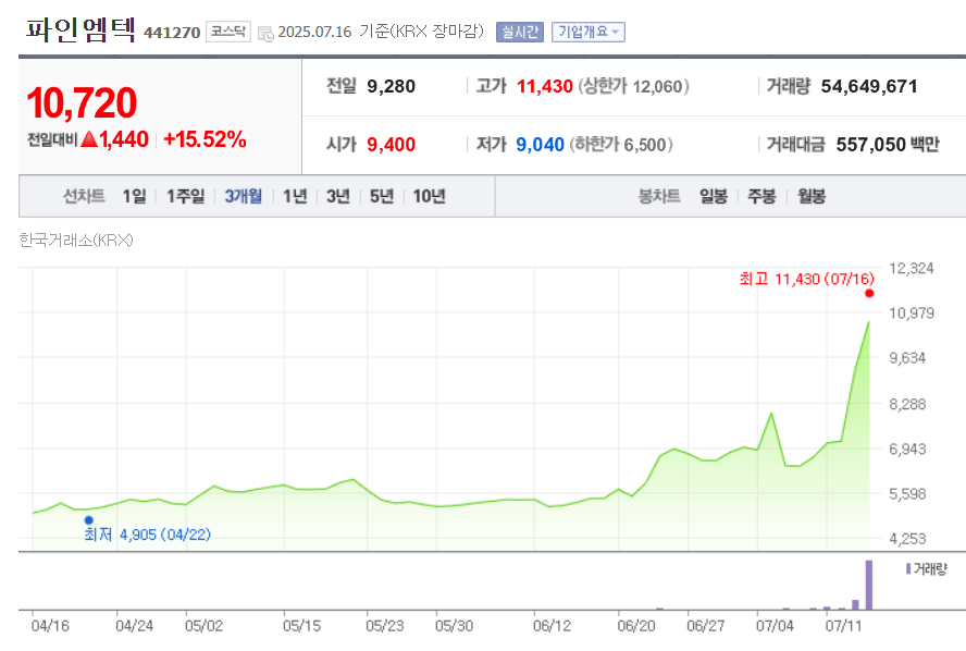 파인엠텍은 폴더블폰의 핵심 부품인 '내장 힌지(메탈 플레이트, Metal Plate)'를 생산하는 기업입니다. 이미 삼성디스플레이를 통해 삼성전자와 중국 스마트폰 업체에 내장 힌지를 공급하며 기술력을 인정받았습니다. 특히, 애플이 요구하는 '주름 없는' 디스플레이를 구현하는 데 파인엠텍의 기술이 핵심적인 역할을 할 것으로 기대되면서, 애플 공급망 편입 가능성이 매우 높은 기업으로 주목받고 있습니다. 이에 최근 파인엠텍의 주가가 가파르게 상승하고 있습니다.