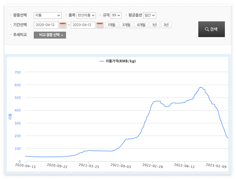 물론 최근 리튬 가격이 하락하는 것은 사실입니다. 아래 그래프에서 보는 것처럼 탄산리튬 가격이 2021년 1월 kg당 58위안에서 2022년 11월에 572위안으로 10배 가까이 급등했다가, 2023년 4월 현재 180위안 수준으로 급락하고 있습니다. 최근 이차전지 주가 전망과 관련해 자주 언급되는 부분입니다.