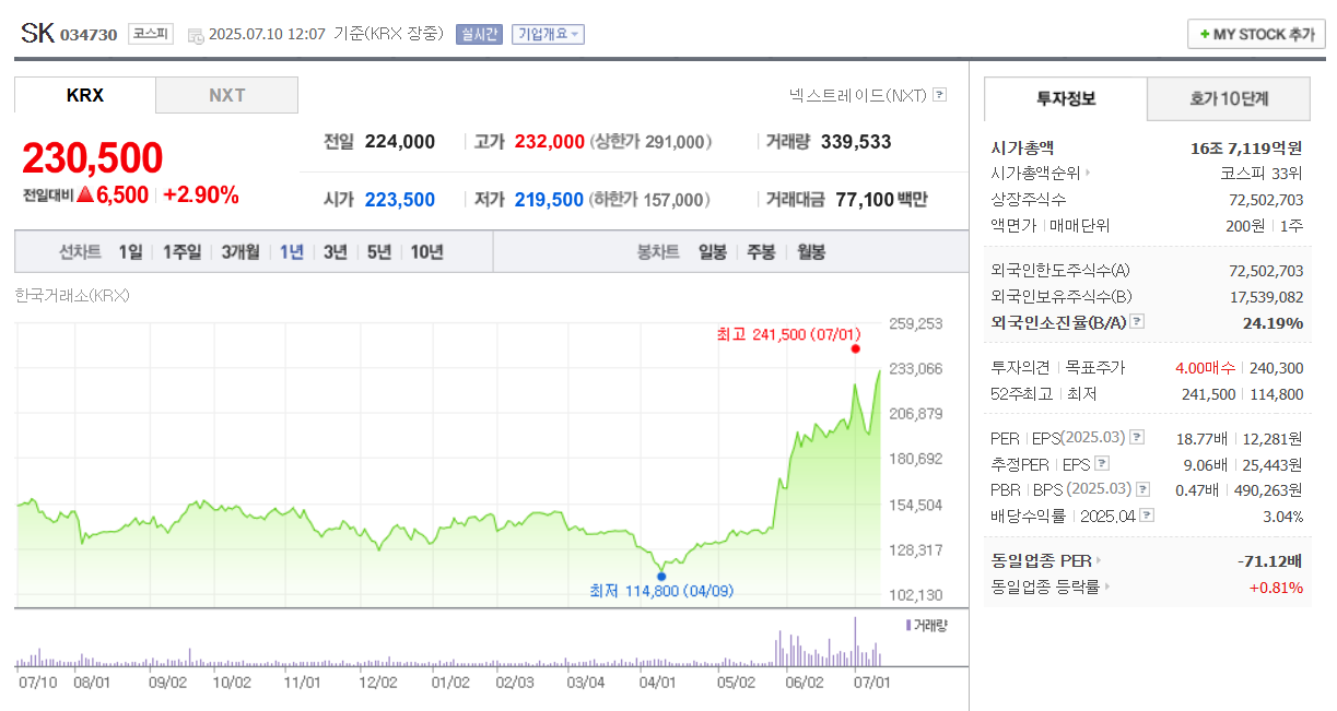 SK도 PBR 0.5배 이하이고, 자사주 비중이 24.8%에 이릅니다. 역시 크게 상승했습니다.