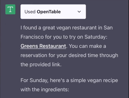 이렇게 요청하면 어떤 일이 벌어질까요? 기존의 챗GPT라면 이런 요청에 답을 하기 어려울 것입니다. 하지만 플러그인을 장착한 챗GPT는 이렇게 답을 해줍니다. 먼저 토요일에 갈 수 있는 샌프란시스코의 비건 레스토랑을 찾았다고 답을 합니다. Greens Restaurant이라는 곳입니다. 링크에 들어가면 원하는 시간에 예약할 수 있다고 합니다.