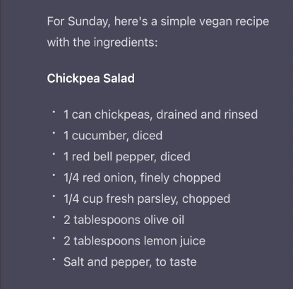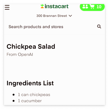 그런 다음 챗GPT에 다음과 같이 요청한다고 합시다 : "이번 주 주말에 샌프란시스코에서 비건 푸드를 먹으려고 해. 토요일에 갈 수 있는 괜찮은 레스토랑 하나 추천해 줄 수 있을까? 그리고 일요일을 위한 간단한 레시피(그냥 재료들)을 추천해줘. 울프램알파(WolframAlpha)를 사용해 레시피 칼로리도 계산해주고, 마지막으로 재료들을 인스타카트로 주문해줘."