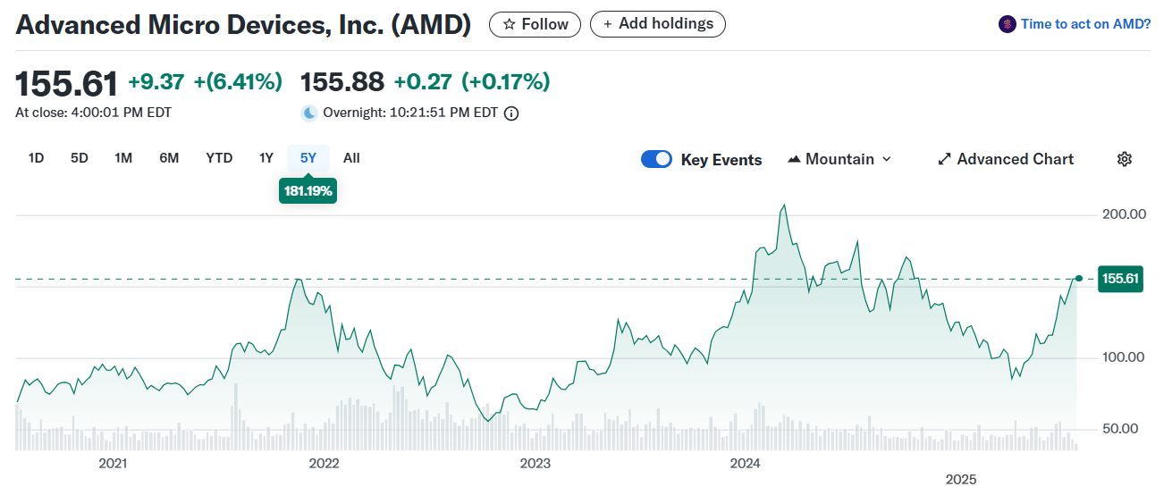 그런데 최근 AMD 주가가 빠르게 상승하는 모습을 보이고 있습니다 어제(7월 15일, 미국 현지시간 기준)는 6.41% 상승한 155.61달러로 마감했네요.