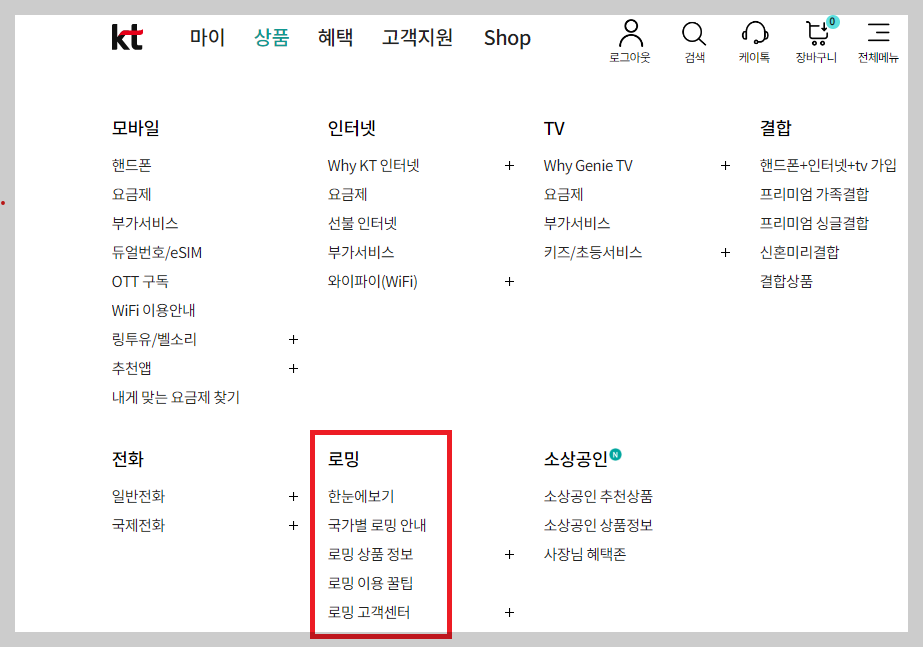 일단 KT 홈페이지에 들어가서 '상품'란에 보니 '로밍' 서비스에 관해 들여다 볼 수 있었습니다.