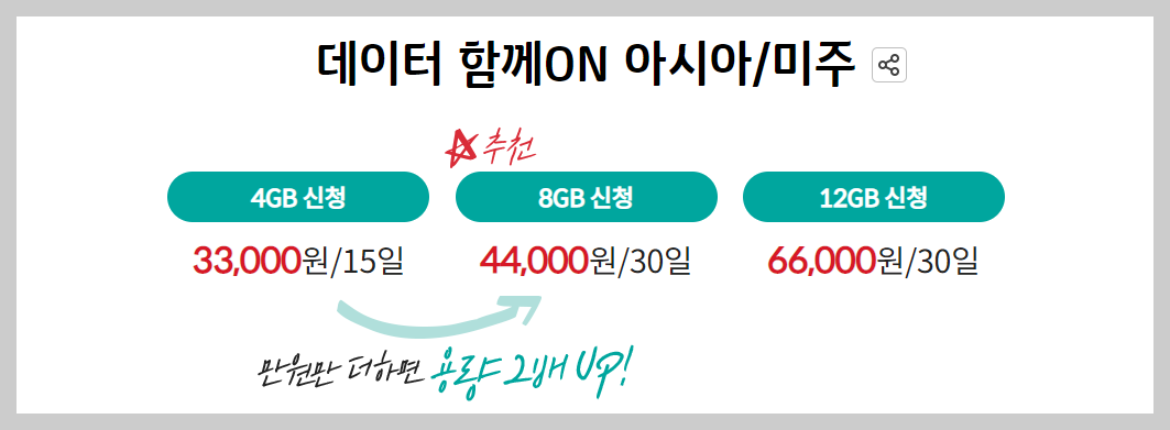 클릭하자마자 바로 이런 문구가 눈에 들어왔습니다. 15일 4GB에 33,000원, 30일 8GB에 44,000원이라는 것입니다.