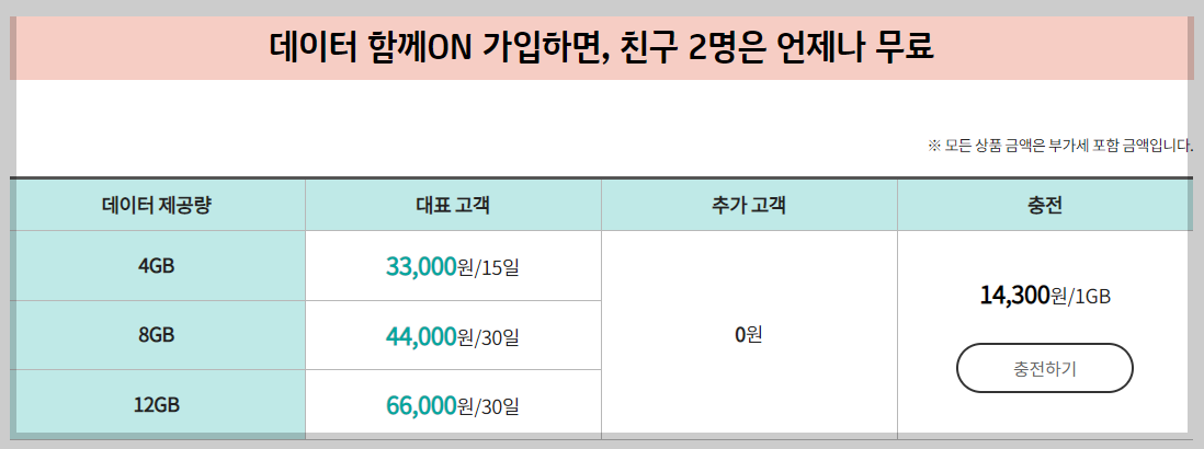 본인 포함 친구 2명이라고 했으니 가족 3명이 8GB를 선택하면 44,000원이라는 뜻입니다. 앞에서 보았듯 유심칩 3개를 구입하는 것보다 훨씬 저렴한 가격입니다.