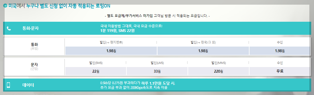 정말로 이렇게만 하면 되는 것인지 궁금해서 KT에 직접 전화로 문의를 해보았습니다. 안내해 주시는 분께서 친절하게 설명해 주셨습니다. KT에 해외로밍을 신청하면 유심칩을 갈아끼울 필요도 없이 여행지에 가서 핸드폰을 한번 껐다켜면 된다고 합니다. 통화료도 저렴했습니다. 1초에 1.98원으로 1분이면 약 120원이라고 합니다. 문자의 경우 수신은 무료, 발신은 SMS 22원, LMS 33원, 사진을 포함한 MMS는 220원이라고 합니다. 처음 생각했던 가격을 감안하면 아주 괜찮은 요금이었습니다.