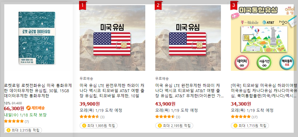 그리고 세 번째, 이번에 몇 년 만에 다시 미국여행을 가게 되었습니다. 지난 유럽여행때 편리하게 사용했던 경험 때문에 이번에도 유심칩을 대여할까 생각을 했었습니다. 문제는 가격이었습니다. 쿠팡에서 검색해 보니 10일 동안 무제한으로 사용할 수 있는 유심칩이 39,900원이더군요. 가족 3명이 구입하면 약 12만원에 이르는 가격이었습니다. 아무래도 비용을 생각하지 않을수 없었습니다.