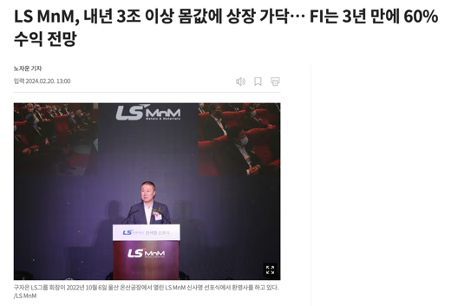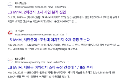 여기에 LS엠앤엠은 이차전지 소재사업에도 뛰어들고 있습니다. 언론보도를 검색해보면 관련기사들이 많은 것을 볼 수 있습니다. 사업포트폴리오가 유망한 시장에 전방위적으로 걸쳐 있다고 할 수 있습니다.