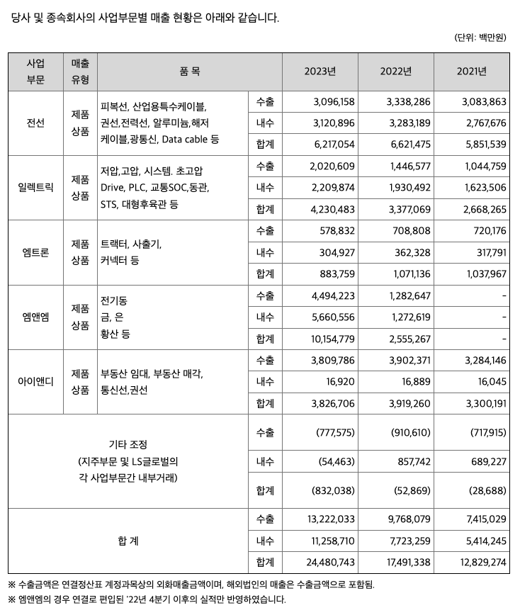 다만 LS와 관련해 고려해야 할 점이 있습니다. LS의 사업부문별 매출액을 살펴보면 흥미로운 점이 있습니다. LS의 사업보고서에는 다음과 같이 종속회사들의 실적이 기재되어 있습니다.